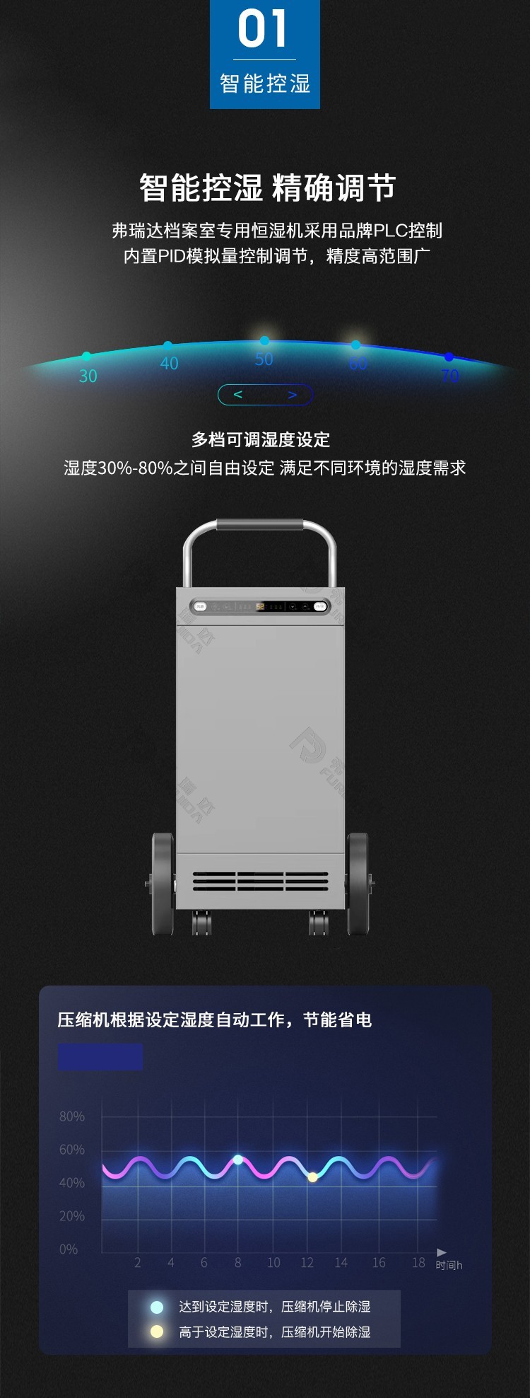 備注:濕度達到設定值,設備會自動停止工作,環(huán)境濕度高于設定值,自動啟動降低用電能耗。